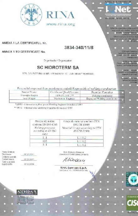 - Autorizatie ISCIR conform PT C4-2010, pentru reparare la recipiente metalice stabile cu Vmax=200 mc, pmax=100 bar, Tmin=-500C, Tmax=4500C;