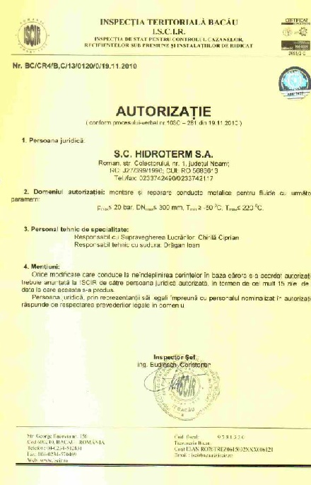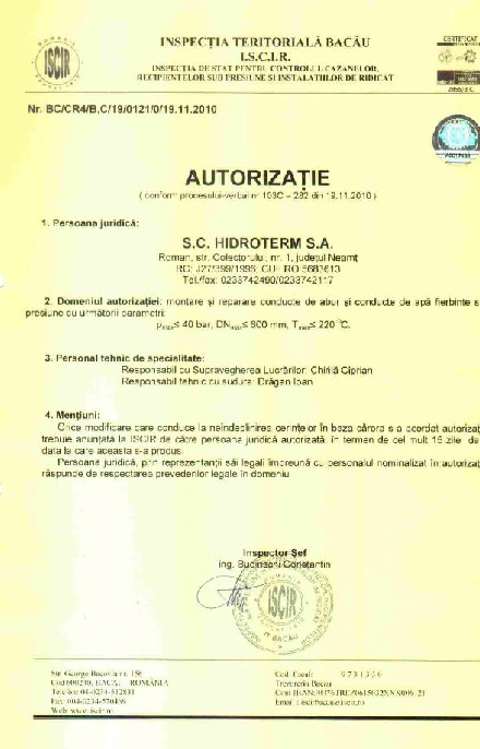 - Autorizatie ISCIR conform PT C10-2010 , pentru montare si reparare conducte de abur si conducte de apa fierbinte sub presiune;