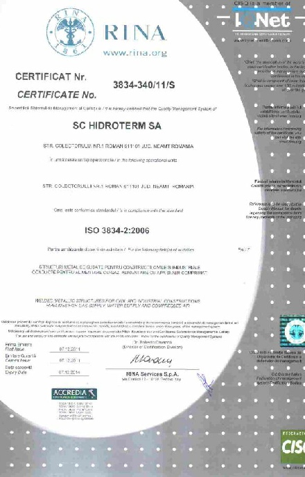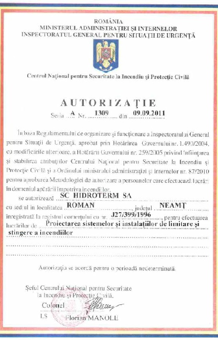 Firma SC HIDROTERM SA isi desfasoara activitatile intr-un cadru reglementat conform legislatiei in vigoare, respecatnd toate prescriptiile necesare. Astfel s-au obtinut urmatoarele certificari si autorizatii: